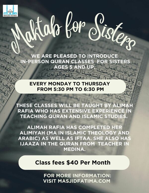 We are please to introduce in-person Quran classes for sisters ages 5 and up