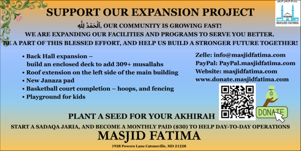 Place: Masjid Fatima, 1928 Powers Lane, Catonsville, MD, 21228
